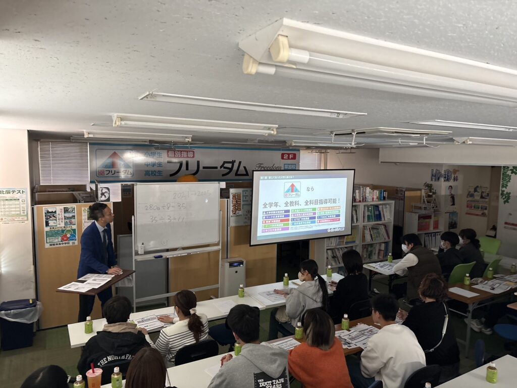 また、今回の説明会で話題に出た「ブロードバンド予備校」の映像授業は、個別指導フリーダムの自習室でも受講可能です。興味のある方はお気軽にスタッフまで!